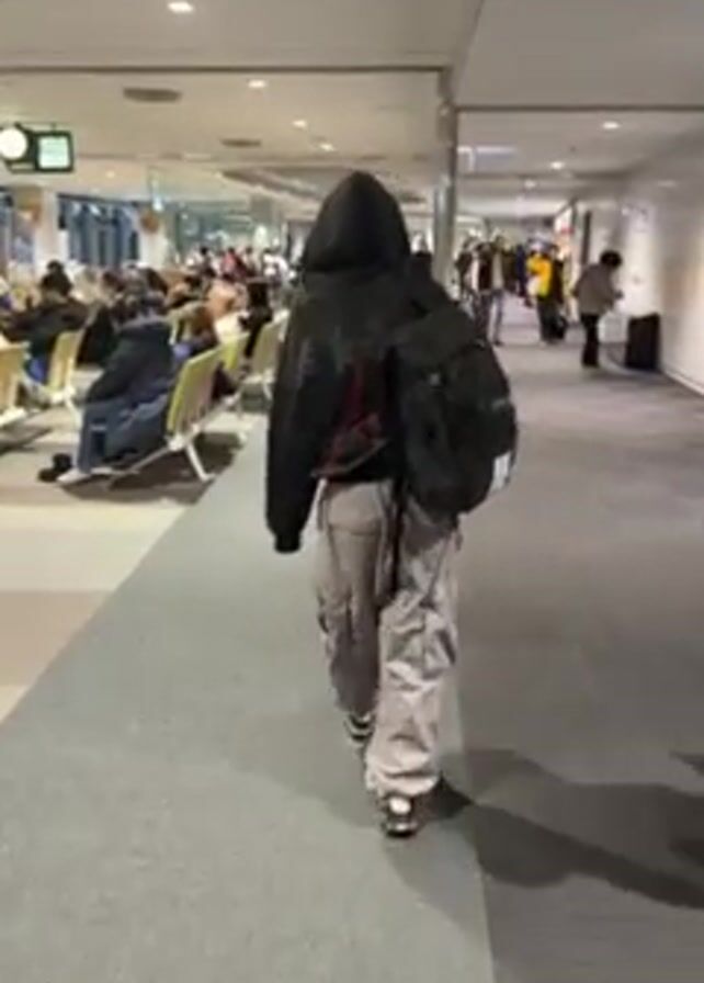 A person wearing a black hoodie, gray cargo pants, and a black Adidas backpack walks down a gray carpeted hallway at an airport. The person is walking away from the camera. To the left, there are rows of chairs filled with people waiting. To the right, other people are walking in the opposite direction. An announcement is being made in Japanese.