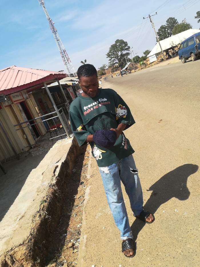 An outdoor scene in Bahit, Nigeria, depicts a young male standing on a dirt-colored ground beside an unpaved road and a shallow drainage ditch. The male, with dark skin and short dark hair, wears a dark green, short-sleeved t-shirt featuring white graphics, including "Process Club," "Make no mistake," and a Hello Kitty character, along with cutouts on the chest and shoulders. He is dressed in light blue ripped jeans and black quilted slide sandals. His head is tilted downwards, focused on a dark blue/purple knitted object, possibly a cap or ball of yarn, held in both hands. A long shadow of the male is cast on the ground to his right. To the left of the male, a single-story structure with a red corrugated metal roof, appearing to be a series of shops, is visible, fronted by metal railings or security bars. Above and beyond this structure, a tall, white and red striped communications tower dominates the skyline against a clear blue sky. To the right of the male, a wide, unpaved road extends into the background, where additional buildings with light-colored roofs, scattered trees, utility poles with power lines, and a parked blue van are discernible. Faint outlines of other vehicles suggest distant traffic.