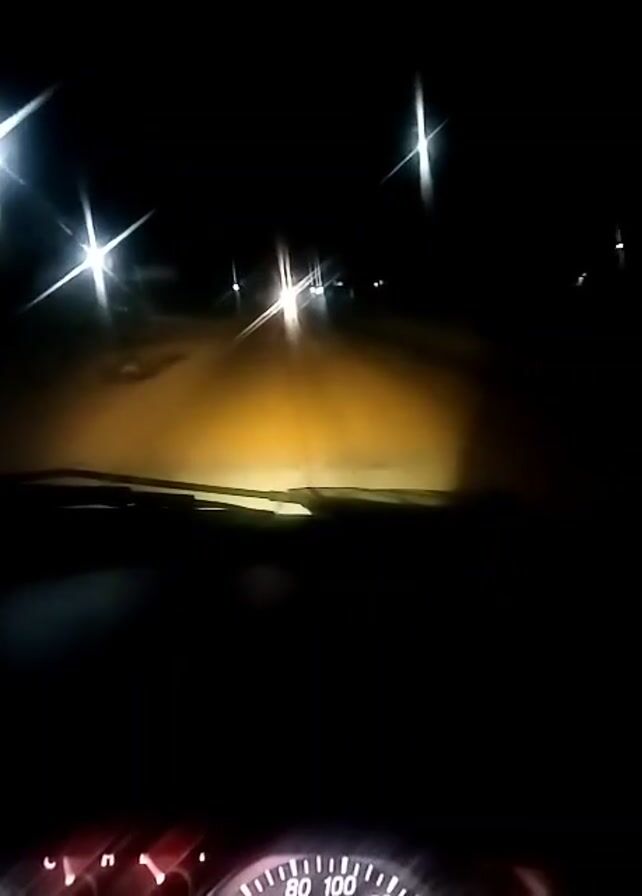 nighttime drive from the driver's perspective. The road is dark, illuminated by the car's headlights and streetlights. The dashboard is visible at the bottom of the frame, showing the speedometer. Other vehicles are seen on the road ahead. The camera is relatively stable, indicating smooth driving.