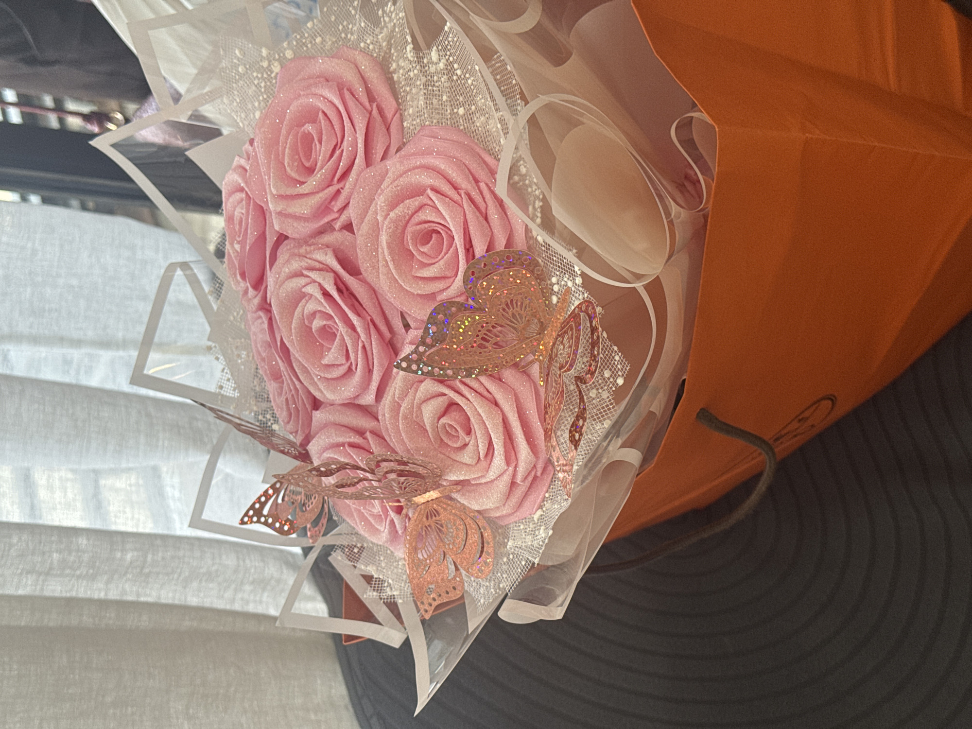 A bouquet of seven pink, glitter-dusted artificial roses is displayed indoors. The bouquet is wrapped in white mesh netting with white bead accents and clear plastic film incorporating white geometric designs. Several iridescent, rose-gold butterfly ornaments are attached to the wrapping. The bouquet rests within an open, bright orange gift bag, displaying a dark brown string handle on its left. The bag is situated on a dark, horizontally ribbed surface. A light-colored, semi-transparent curtain partially covers a background window. The setting is in Davao City, Philippines.