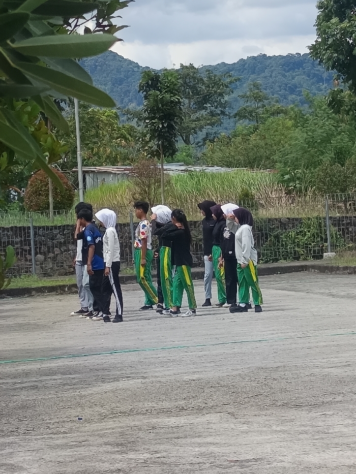 A group of young people stands on a paved area, facing left. Some wear tracksuits with green and yellow stripes down the sides. Others are in casual clothing. Several are wearing head coverings. A fence is behind them, with trees and a mountain range in the background under a cloudy sky. A large tree branch partially obscures the left side of the image.