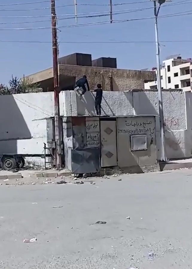 two young males climbing a gray concrete wall. The wall is topped with large, rough-hewn rectangular blocks. The two males climb onto the wall from the roof of a small, corrugated metal building that is attached to the wall. The building has graffiti or signs written in Arabic on its surface. The first male climbs on top of the wall, and sits down. The second male stands up and briefly gestures toward the seated male. The scene takes place on a sunny day, and a street with some litter on it is visible in the foreground. A taller building can be seen in the background.