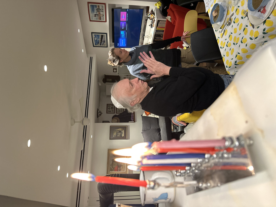 An indoor scene captures an elderly man with a white kippah, possibly praying with hands up, alongside a younger woman. Lit candles in a menorah stand prominently in the foreground. Behind them, a living area includes a TV, artwork on the walls, and furniture like a red chair. Part of a table covered with a lemon-patterned cloth is visible to the right, holding plates and cutlery. The angle is slightly tilted.