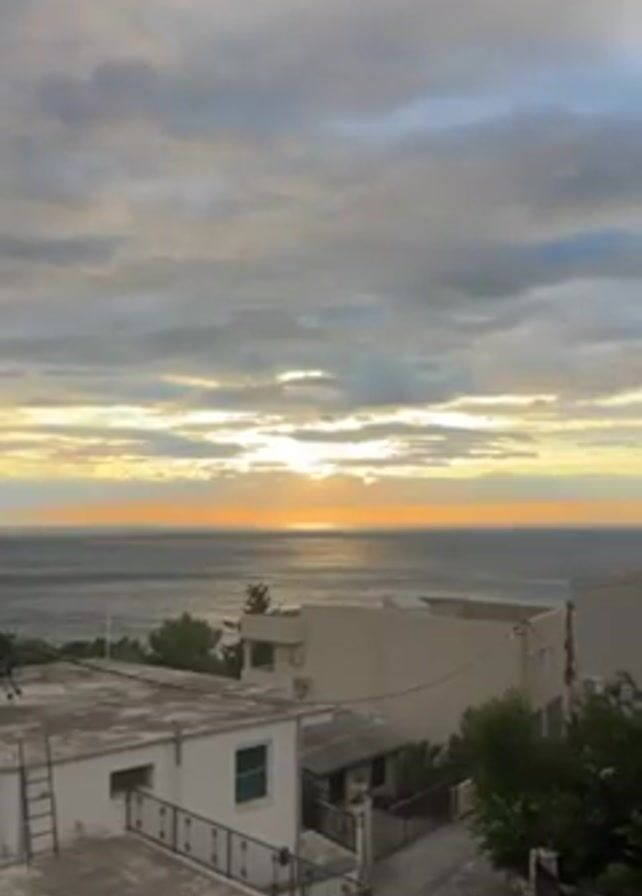 The video captures a scenic view of the ocean during what appears to be either sunrise or sunset, with the sun's rays reflecting on the water. The sky is filled with clouds, allowing only glimpses of the sun. In the foreground, there are several low-rise buildings with flat roofs, typical of coastal architecture. There is a small road or pathway visible in between the buildings, and some greenery is scattered around the area. The scene is peaceful and serene, despite what appears to be a slightly windy condition evidenced by the sound.