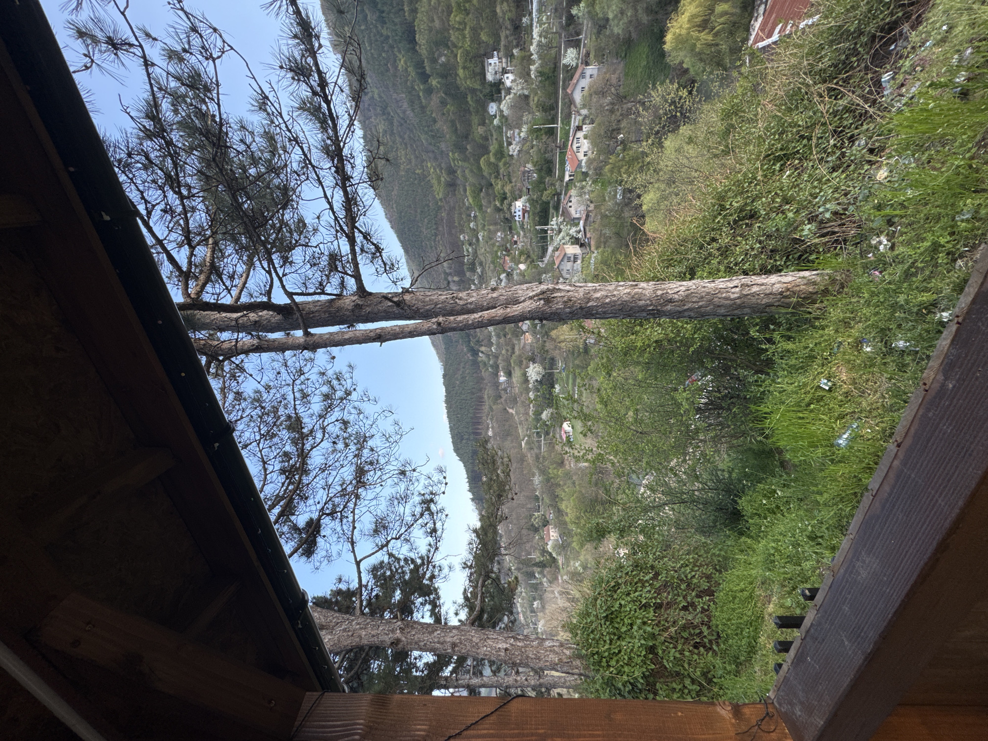 The scene is an outdoor view from a slightly elevated position, possibly a balcony or porch, in or near the city of Rodina, Bulgaria. The foreground shows parts of a wooden structure, including a roof and railings. A large pine tree with sparse foliage extends into the frame, obscuring part of the view. Beyond the tree, a lush green hillside slopes downward, dotted with residential buildings. The town is nestled in the valley. The sky is visible through the branches. The overall impression is one of a tranquil, rural or semi-rural setting in Bulgaria.
