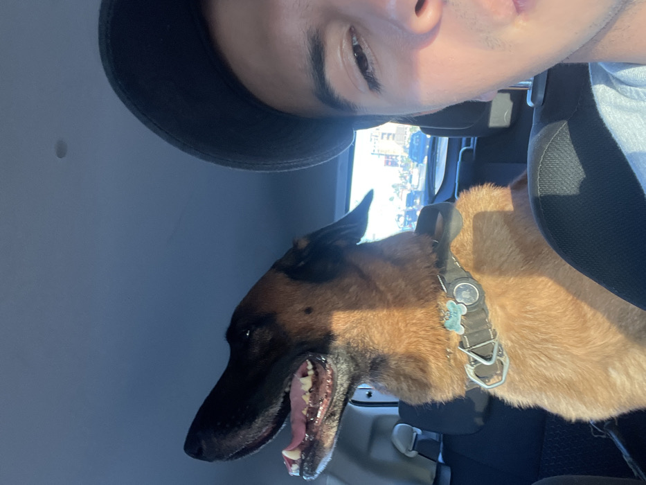 The image depicts a man and a dog in the interior of a vehicle during daylight hours in Coatzacoalcos, Mexico. The scene is captured from a first-person perspective, with the upper right quadrant showing a portion of a male individual's face, specifically his right eye, nose, and mouth, partially illuminated by direct sunlight. He wears a dark baseball cap. Positioned to the left of the man and slightly behind him, occupying the left and central areas of the frame, is a medium-sized dog, possibly a Belgian Malinois, with tan fur, a black muzzle, and erect ears. The dog is seated upright in the rear passenger seat, facing forward and slightly upward, with its mouth open, exposing its teeth and a portion of its tongue, indicating panting or alertness. It wears a black tactical-style collar featuring metal D-rings, a light blue bone-shaped tag, and a circular metallic tag. Through the vehicle's rear window, a sunny urban street scene is visible, indicating the vehicle is in motion or stopped in traffic. Multiple cars are present on a multi-lane road, suggesting a busy thoroughfare. In the background, several multi-story buildings are observable under a clear blue sky. The general appearance of the buildings and the busy traffic is consistent with a major urban avenue, such as the Malecón Costero, in Coatzacoalcos, Mexico. The interior of the vehicle shows dark headrests and light-colored ceiling upholstery.