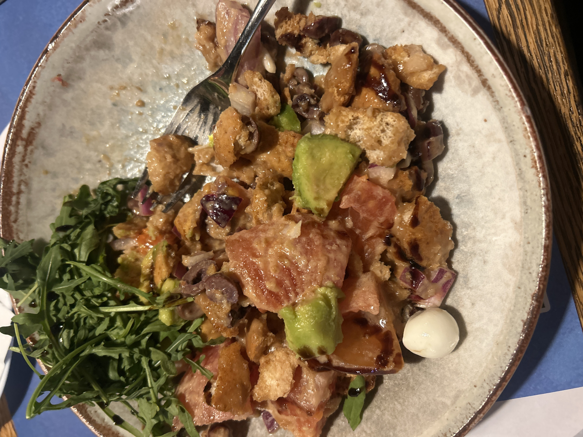 A close-up shot depicts a partially consumed salad on a ceramic plate with a mottled gray and brown rim. The salad includes croutons, tomatoes, sliced avocado, red onion, and a drizzle of dark sauce, possibly balsamic glaze. A small, white mozzarella ball sits near the plate's edge. A fork rests among the salad ingredients. A handful of arugula is visible on the left side of the plate. The scene suggests a restaurant setting, with a glimpse of a wooden table edge and a blue surface in the background. The location of Kalofer, Bulgaria, is not discernible from the visual information provided.