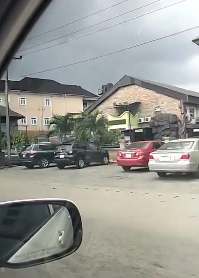 The view from inside a car driving down a street shows parked cars, buildings, utility poles, and a Lesukaa sign