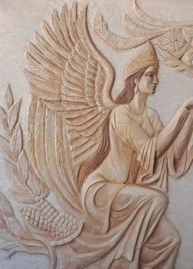 wall with a 3D bas-relief sculpture of a winged woman