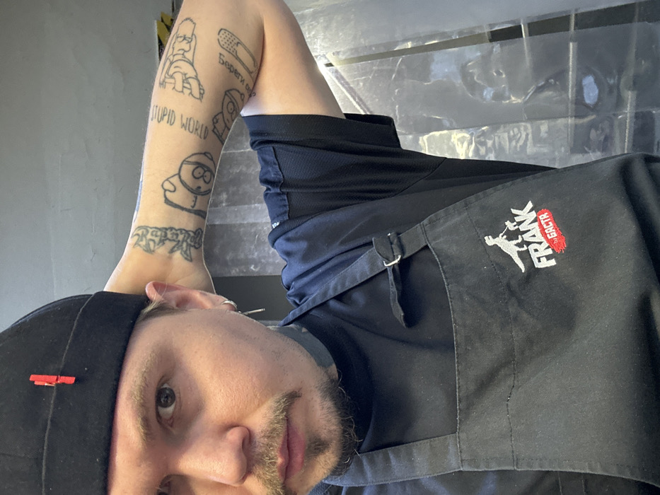 An individual is depicted in a close-up, chest-up photograph, likely taken within a Frank by Basta restaurant in Moscow, Russia, identifiable by the uniform. The subject is a male-presenting individual with fair skin, brown eyes, a mustache, and a goatee. A black neck tattoo is visible. The left ear features a silver hoop earring and a silver dangle earring. He wears a black beanie with a red clip attached to the front, a black short-sleeved shirt, and a black apron. The apron is embroidered with a white logo featuring a T-Rex walking a small dog on a leash, above the word "FRANK" in white and "by GACTR" (referencing "by BASTA") in red. His left arm is bent, with the hand positioned behind the head, exposing multiple black line-art tattoos on the forearm, including a cartoon bear, the phrase "STUPID WORLD," a band-aid, and other stylized designs. The background consists of a light-colored wall or ceiling on the left and a translucent, possibly corrugated, plastic sheet or curtain on the right. The lighting is uniform and artificial. The individual gazes directly into the camera.