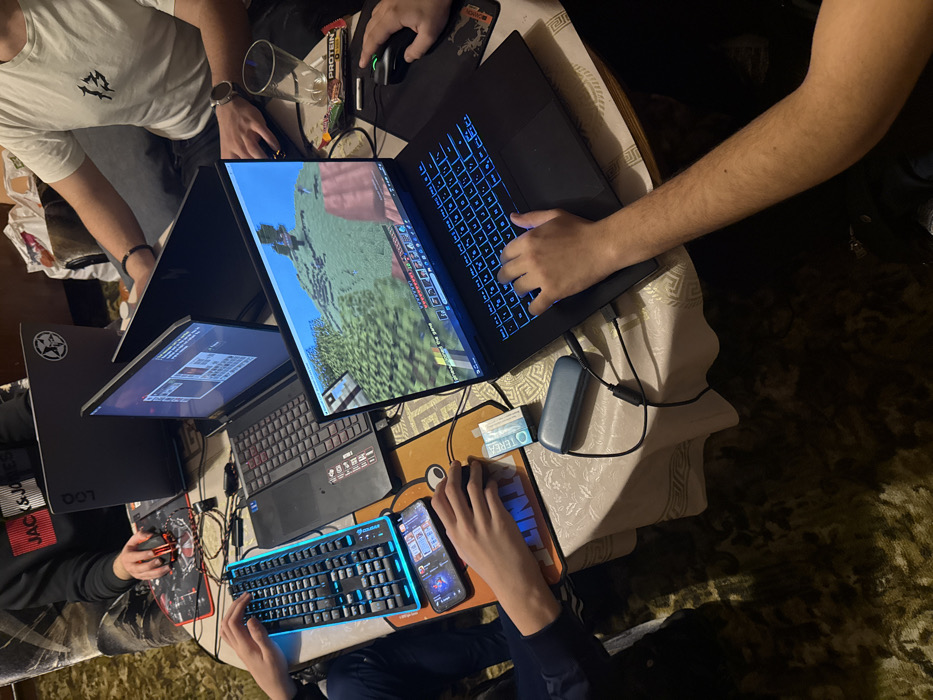 The scene depicts four individuals engaged in a gaming session around a central, light-colored table covered with a patterned tablecloth, located in Simeonovgrad, Bulgaria. The floor is covered by a dark green, textured carpet. Four laptops are positioned on the table. In the upper left quadrant, a person wearing a black hoodie with "JACK & JONES" branding operates a red gaming mouse on a black mousepad. A black laptop with a star decal on its lid is in front of them, its screen displaying a dark interface. To the upper right, a second individual wearing a white t-shirt is partially visible. A glass tumbler and a "PROTEIN BAR" wrapper rest near their hand. A black laptop with an angled secondary screen or privacy panel is in front of them, displaying an inventory-style interface. In the lower left quadrant, a third person is positioned. Their left hand operates a blue backlit mechanical keyboard, while their right hand uses a black gaming mouse on an orange mousepad. A smartphone displaying a mobile game application is placed beneath the keyboard. A pack of "TEREA" tobacco sticks and a blue electronic device (possibly a portable charger or heated tobacco device) are situated near the mouse, connected by cables. A black gaming laptop displaying an inventory interface is in front of this person. In the lower right quadrant, a fourth person uses their right hand to manipulate the blue backlit keyboard of a black gaming laptop. The laptop's screen displays a first-person perspective of a block-based video game landscape, featuring green terrain and trees. A black gaming mouse rests on a stylized mousepad to the right of the laptop. Numerous cables, USB hubs, and power adapters interconnect the various laptops and peripherals across the table, indicating a network of devices. The individuals are focused on their respective screens, actively interacting with their gaming setups.