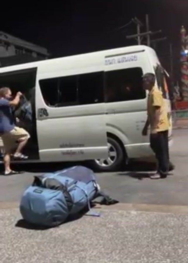passengers disembarking from a white van at night. Two individuals are seen stepping out of the van, while a man in a yellow shirt stands near the open door, seemingly observing the passengers. A large blue backpack lies on the ground next to the van. Streetlights illuminate the scene, and festive decorations can be seen in the background.