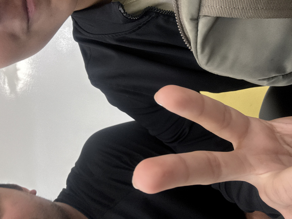 The image displays two individuals in an unspecified indoor location within Monterrey, Mexico. In the foreground, a right hand performs a peace sign gesture, with the index and middle fingers extended upwards. This hand belongs to the individual on the right, whose lower face and upper torso are visible. This individual wears a black zippered jacket over a lighter-colored garment, and a light green/grey bag with a visible zipper and textured strap is positioned to their right. To the left, the lower face and shoulder of a second individual are visible, clad in a black long-sleeved shirt. The background features a plain white wall, illuminated by a bright light source causing a reflection in the upper right quadrant. A narrow horizontal strip of yellow is visible in the lower background, indicating an object such as a chair or bench.