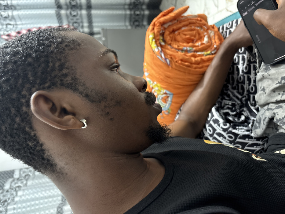 - "A man lies down wearing a black shirt with a small silver hoop earring" by FM-Jrgoe2, licensed under CC BY 4.0