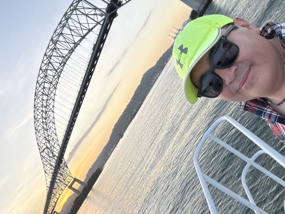 The image depicts a male individual taking a selfie from a boat, positioned in the lower right foreground