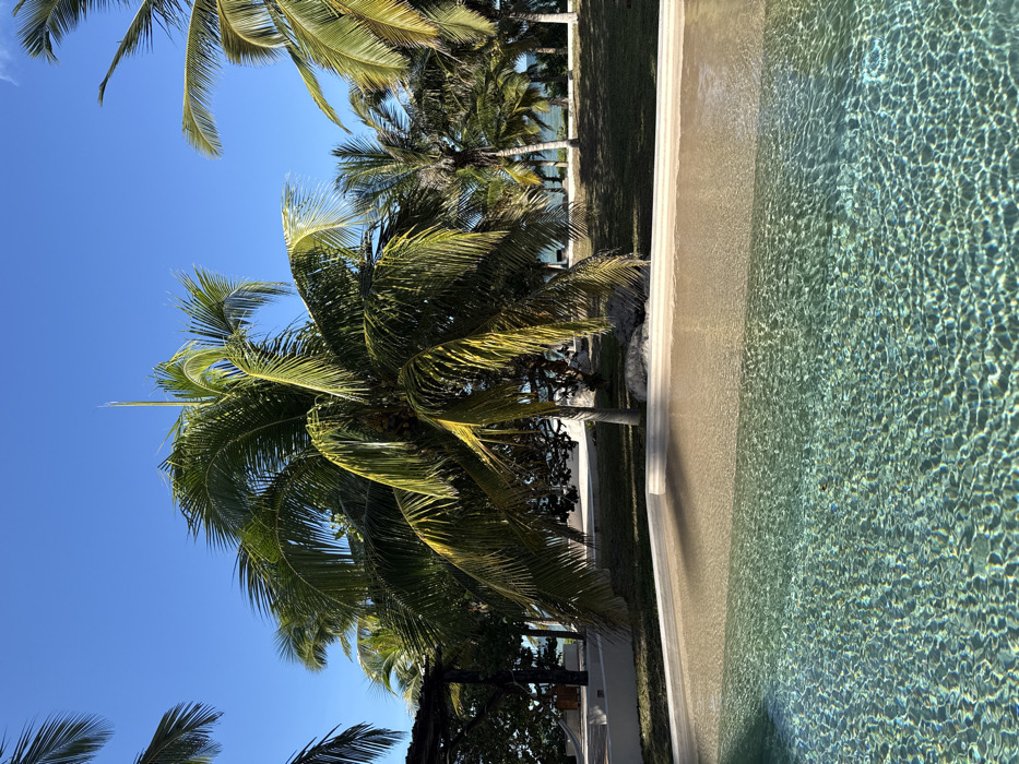 Palm trees against a clear blue sky are partially seen over a swimming pool's edge. The pool water is a light aqua color with sun-dappled patterns. Lush green foliage surrounds the palm trees, creating a tropical ambiance. The image is vertically oriented, capturing the tranquil scene of a beachfront property. The shot emphasizes the natural elements and the pool's inviting waters.