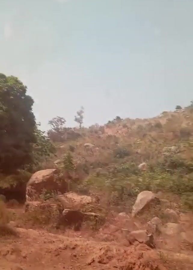 The video depicts a dry, rocky hillside on a sunny day. The ground is reddish-brown, and scattered with rocks and sparse vegetation. Several trees dot the hillside. The camera moves, showing more of the landscape as it pans upwards towards a clear, blue sky. The environment appears arid.