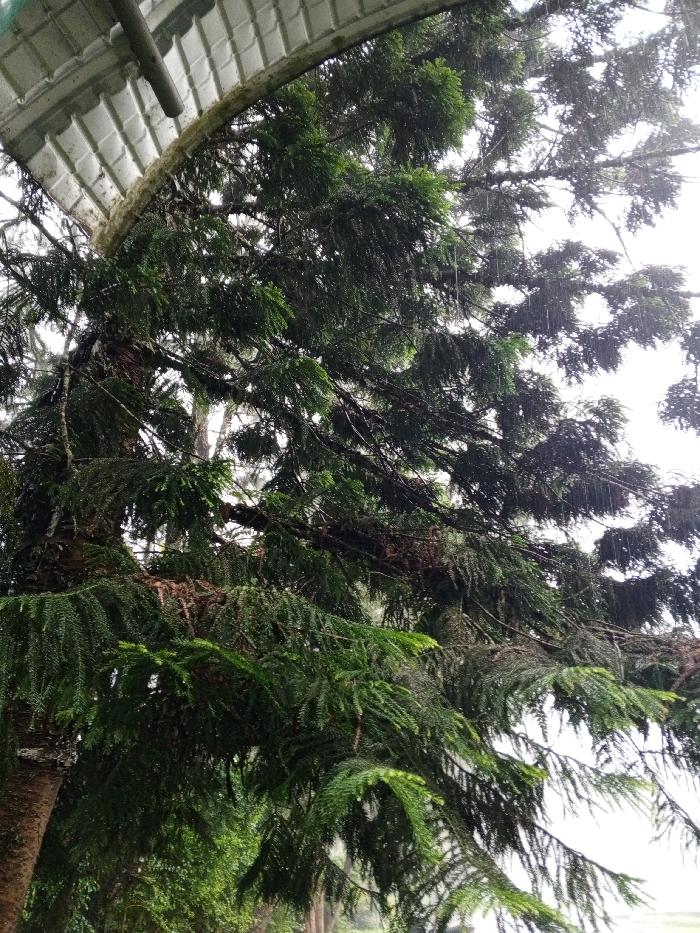 A tall, mature conifer tree with dense, drooping foliage fills the frame, partially covered by a white corrugated roof structure in the upper left corner. It is raining, with visible raindrops descending through the tree's branches. The tree trunk is visible on the lower left. In the background, the scene appears overcast.