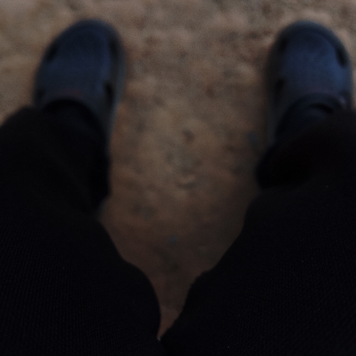 A blurred, first-person, downward-facing perspective captures an individual's lower extremities