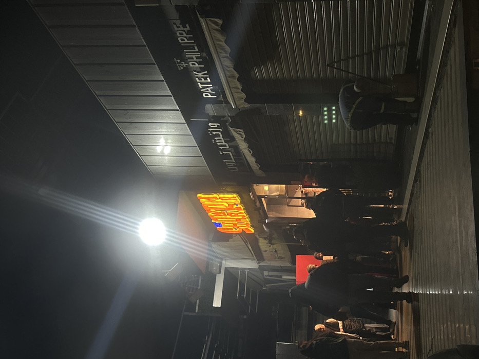 A nighttime street scene features a crowd of people standing in front of a shop. Bright light obscures details. A sign above reads "Patek Philippe" and another sign is partially visible in Arabic. A worker in a uniform stands on a raised platform, possibly working on electrical fixtures. The street appears wet or reflective.