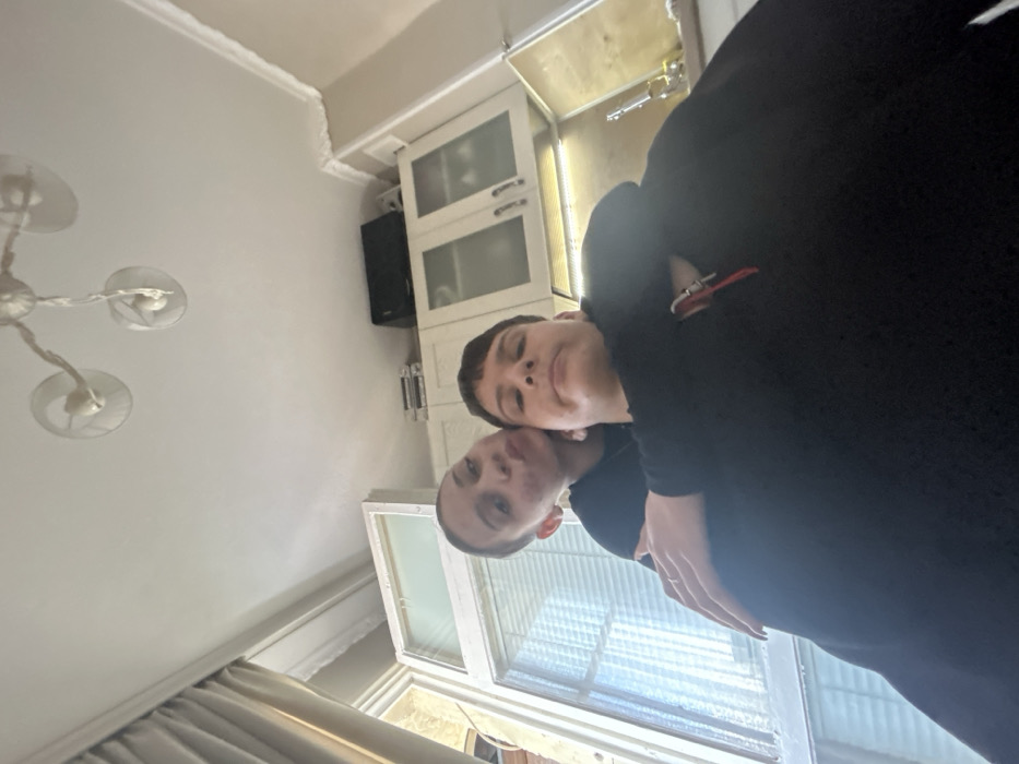 This image depicts two individuals within a residential interior. The person on the left, with dark short hair, wears a dark top and displays a pouting expression, positioned with their right arm wrapped around the torso of the second individual. A ring is present on the left ring finger of the person on the left. The second individual, positioned in front, has dark short hair and wears a dark hoodie with a red lanyard or string visible on the chest area. This individual faces the camera with a neutral expression. The background on the left features a large white-framed window fitted with internal blinds, next to a partially visible light-colored curtain. On the right, a segment of a kitchen area is visible, comprising white upper cabinets with glass panels and silver handles. A dark speaker unit rests atop one of these cabinets. Below the cabinets, a countertop is illuminated by under-cabinet lighting, and a chrome faucet is partially visible. The ceiling is white, accented with decorative crown molding, and a three-bulb chandelier with frosted glass shades is suspended overhead. The precise location within Kozloduy, Bulgaria, is not discernible from the provided visual data.