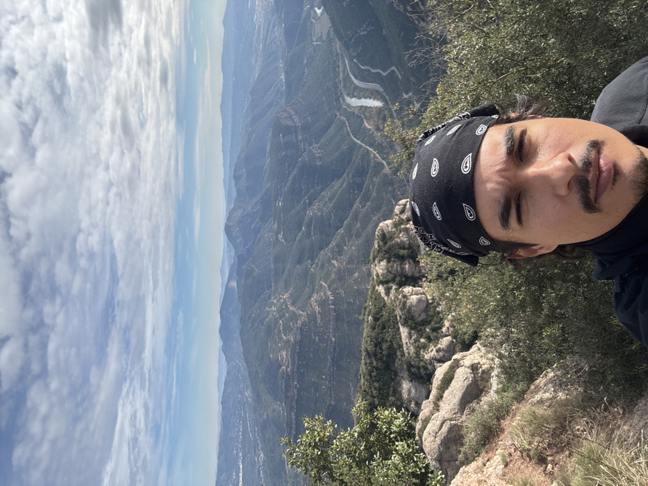 A male individual is depicted in a selfie, occupying the lower third of the frame, positioned against a vast mountainous landscape in Monistrol de Montserrat, Spain