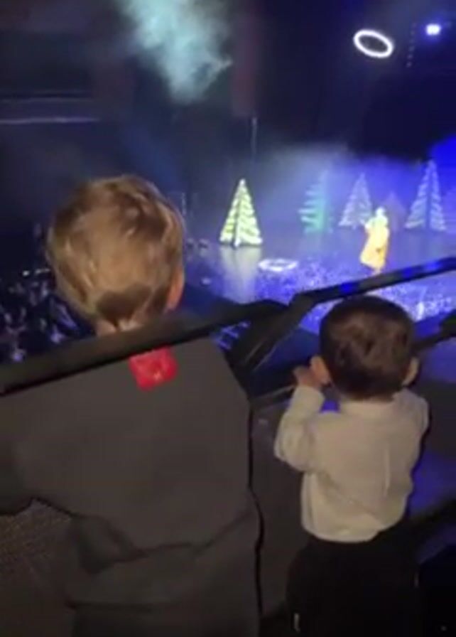 Two young children are watching a stage performance. The older child, with blonde hair, is wearing a gray sweatshirt and black pants. The younger child, with brown hair, is wearing a white shirt and black pants. They are leaning against a railing overlooking the stage. On stage, a performer dressed as the Grinch stands amidst a scattering of white confetti. The Grinch is wearing a yellow and red checkered coat, patterned pants, and green shoes. They have green hair and green gloves. The backdrop features cartoonish Christmas trees and a house. The stage is illuminated with blue lighting and spotlights.
