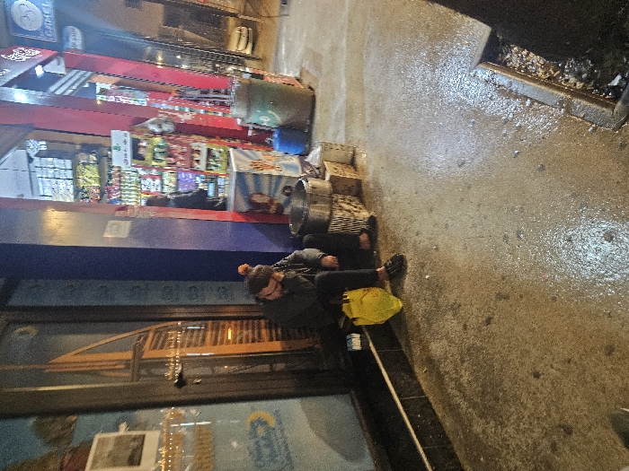 A person is crouched beside a storefront with a yellow bag nearby on a wet city sidewalk. Adjacent to them are metal bins and various stacked items. The storefront, behind the person, displays a depiction of a bridge in its window. A store selling goods is visible, with various products on display and people inside. The storefront is under a sign. A street drain is located on the right edge of the image.