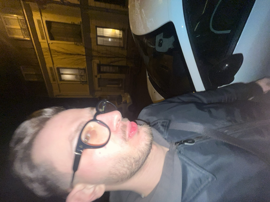 A person with glasses and red lipstick leans toward a white car. Buildings with windows are visible in the background under a dark sky. The person wears a dark jacket. The image is taken at night or in a very dimly lit environment.