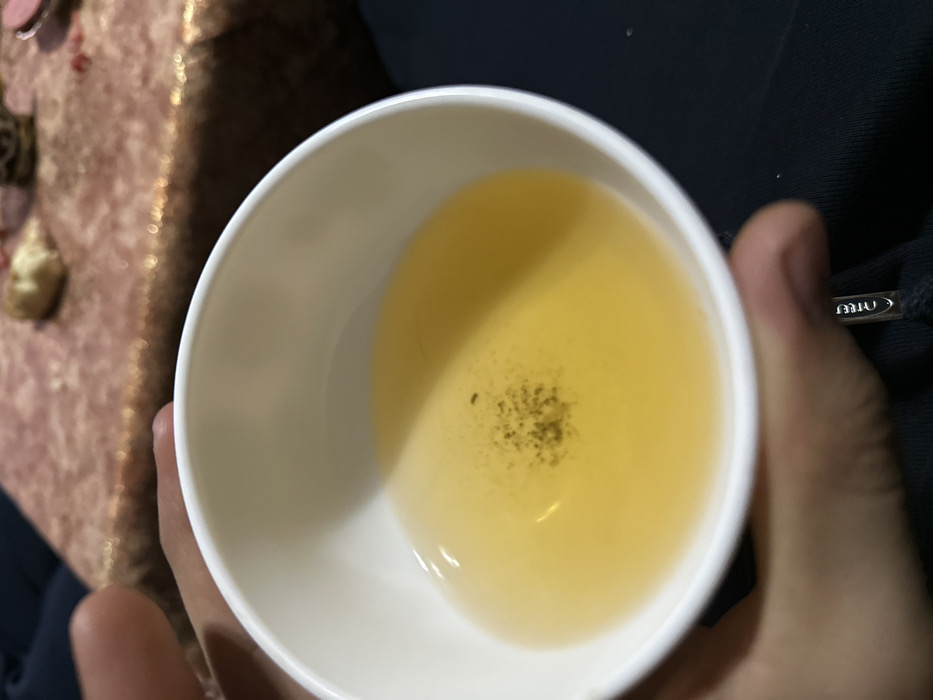 A person holds a white bowl filled with a clear, yellow liquid. Dark green or black specks cluster near the center of the liquid. The bowl is held near a surface with a textured, reflective brown fabric. Parts of a dark blue garment are visible on the right and left sides of the image. A small white tag with "MIU" written on it is visible at the right edge.