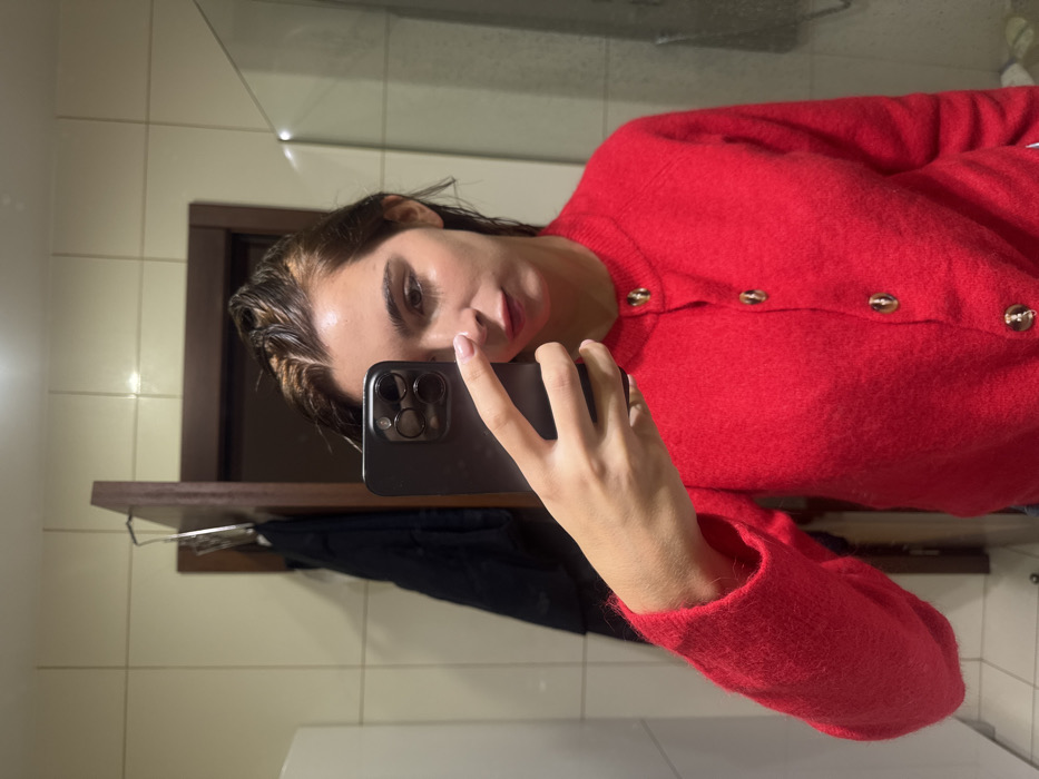 The image depicts a mirror selfie taken indoors within a bathroom located in Nogueira e Silva Escura, Portugal. A female individual, with wet, medium-length dark hair featuring lighter highlights, is captured from the chest up. She is wearing a fuzzy red cardigan with five visible gold-rimmed brown buttons down the front. Her right hand holds a dark-colored smartphone, equipped with a triple camera array, obscuring part of her face as she photographs her reflection. Her right thumb is positioned near the phone's camera lenses. The background consists of light-colored, square-tiled walls. A dark brown wooden door frame is visible behind her left shoulder, with a dark garment hanging from a metallic hanger over the door. A white rectangular fixture is partially visible on the far left, and a clear glass panel, likely a shower screen, is present on the right.