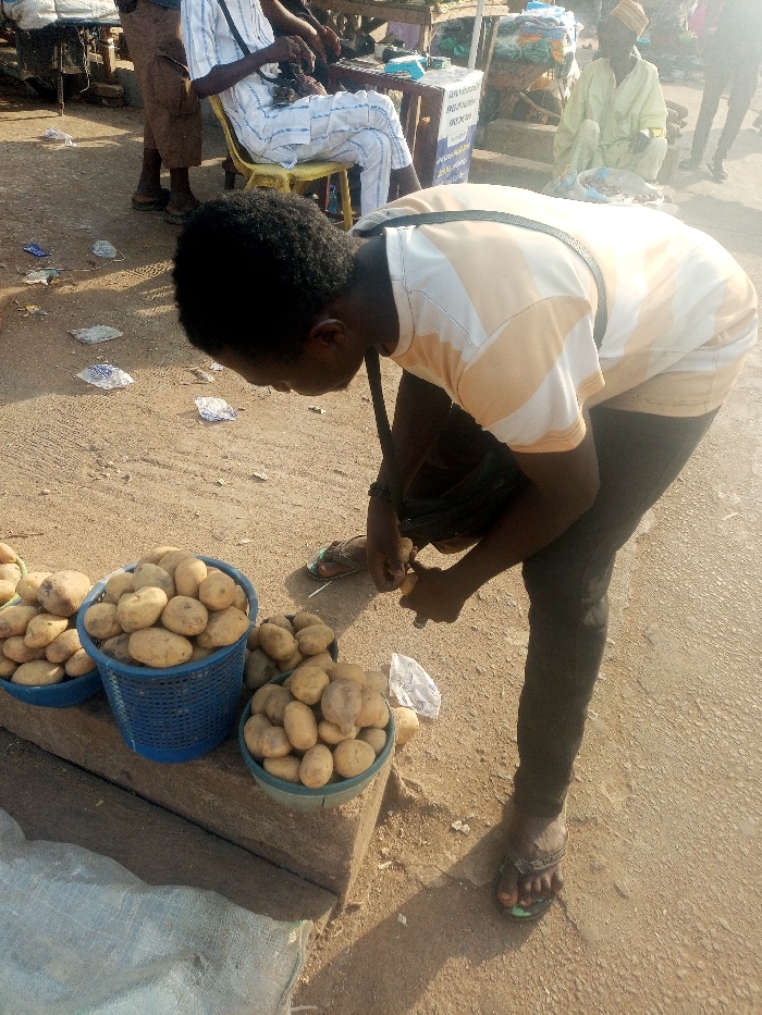 A person in a striped shirt and dark pants stands bent over, peeling potatoes near buckets of them. The potatoes are pale, and the person is wearing sandals. In the background, people are seated, and there is litter on the ground. The scene appears to be outdoors, possibly at a market or roadside.