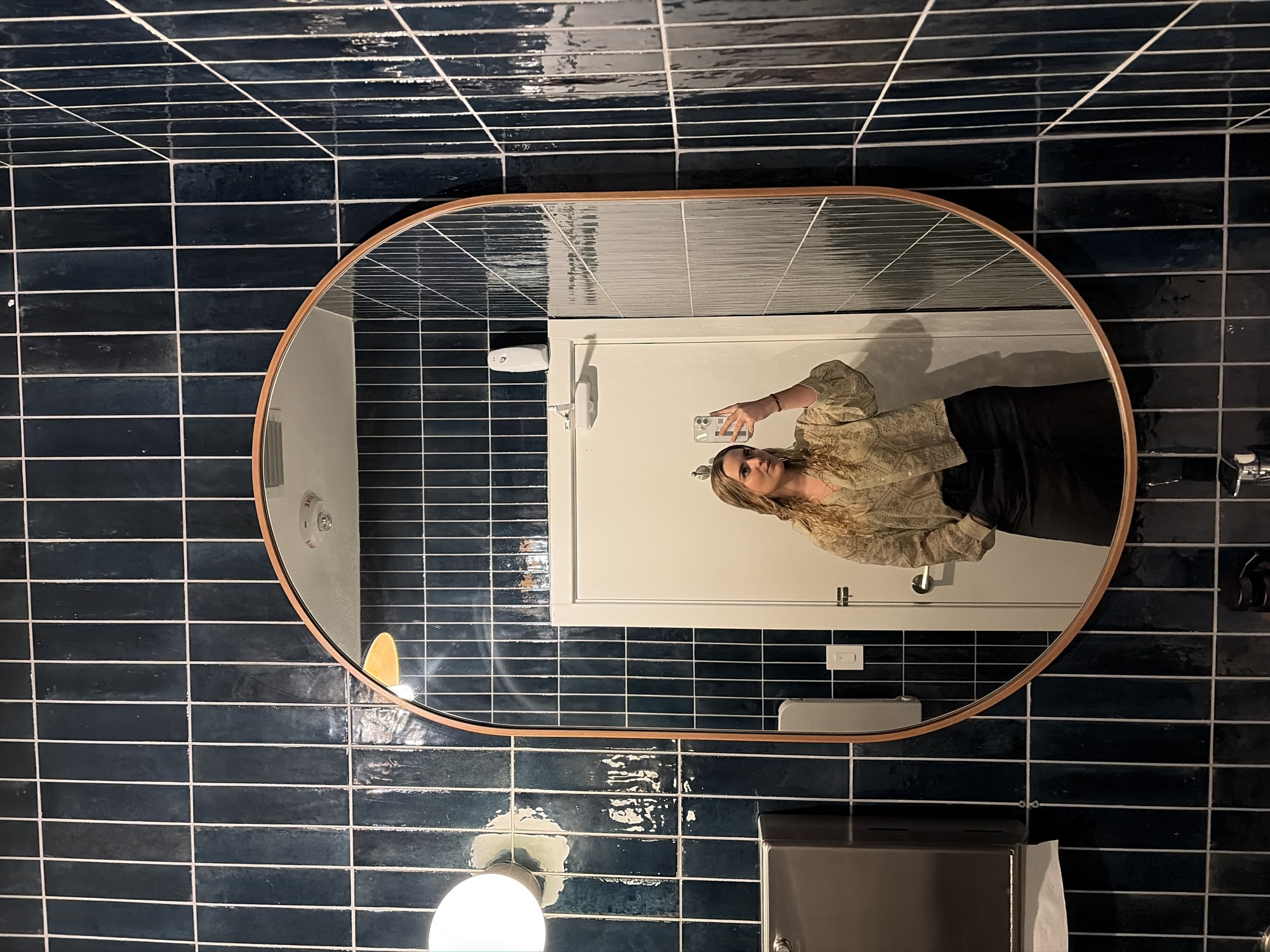 The image is a selfie taken in a bathroom, as reflected in an oval mirror with a wood-tone frame hung on a blue tiled wall. The tiles are laid in a horizontal brick pattern with white grout. The mirror reflects a partial view of a woman holding a phone in her right hand, presumably taking the picture. She has blonde hair and wears a light-colored blouse with puffy sleeves and a dark skirt or pants. Behind her in the mirror's reflection is a white door with a handle and a white rectangular box above the door. Also visible in the reflection are a white toilet, a light switch, and bathroom fixtures. In the foreground, below the mirror, is a stainless steel object, possibly a paper towel dispenser. A round light fixture is visible in the lower left corner of the frame. This location is in the city of Coral Gables, United States of America.
