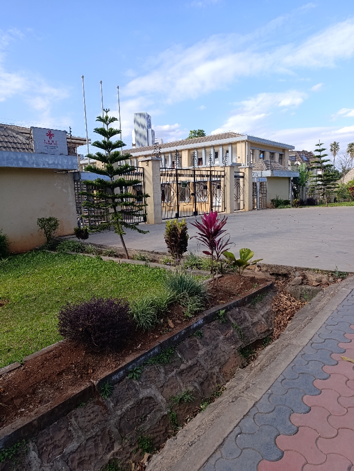 The image depicts the exterior of the SAMU Christian Children's Home (K) in Nairobi, Kenya. The scene is observed during daylight hours under a blue sky with scattered white clouds. In the foreground, a strip of green grass borders a raised garden bed retained by a stone and concrete wall. This bed contains bare soil, a dark purple-leafed bush, various green grassy plants, and a plant with prominent red-purple leaves. To the immediate right of the garden bed, a concrete-lined drainage ditch is present. Further right, a sidewalk composed of interlocking pavers with alternating red and grey/blue patterns is visible. A wide, grey paved driveway leads towards the property's main entrance. The entrance features a substantial black metal gate, ornately designed with geometric patterns and spear-like finials. To the left of the gate, a two-story building with a light-colored facade and a tiled roof is partially visible. A sign mounted on a structure to the left of the gate explicitly identifies the location as "S.A.M.U. CHRISTIAN CHILDREN'S HOME (K) Nairobi." Three tall, slender flagpoles are situated behind a prominent, slender conifer-like tree near the gate. To the right of the main gate, a smaller, single-story light-colored structure, likely a guard booth, is visible, also with a tiled roof. In the background, beyond the immediate property, a tall, modern high-rise building with a distinctive, curved facade is discernible against the sky, consistent with the Nairobi skyline. No individuals are present in the scene, and no actions or interactions are occurring.