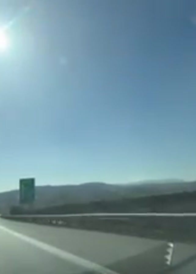 view from inside a car driving on a highway on a bright, sunny day. The road is straight and has white lines marking the lanes. There are metal barriers on the sides of the road. The landscape in the background includes hills or mountains and some sparse vegetation. A green road sign with white lettering, indicating directions to various locations like "Kulata" and "Dupnitsa," is visible on the right side of the road. The sky is clear blue, and the sun is bright, creating a glare. There are no other cars visible in the immediate vicinity.