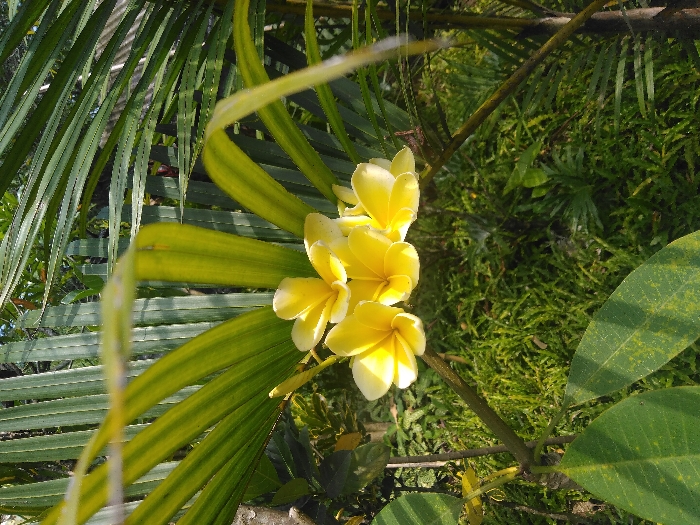- "The image depicts a close-up of a cluster of approximately five plumeria (Frangipani) flowers, primarily yellow with white petal edges, blooming on a dark green stem" by FM-U14g83, licensed under CC BY 4.0