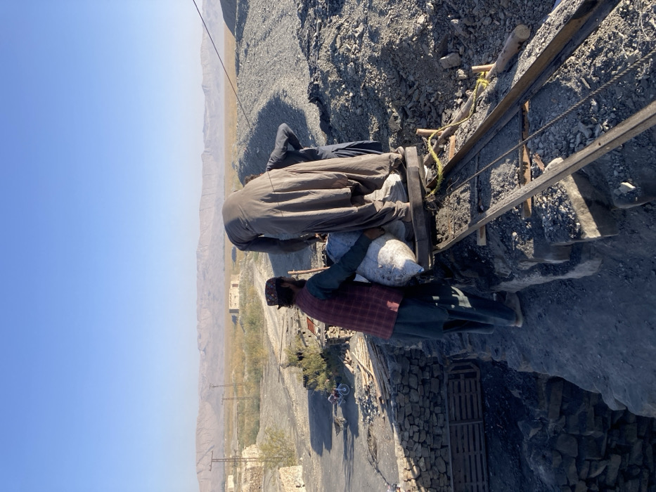 Two men load sacks of coal into a railcar on a steep slope. One wears a plaid shirt and traditional cap, while the other wears a brown robe. The railcar is on a track leading down a hill towards a valley with scattered buildings, power lines, and a road. A rocky, barren landscape stretches out under a clear blue sky. A third person is also visible.