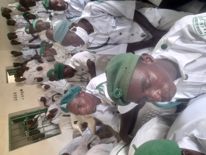 A group of men, mostly older, are seen seated and sleeping. They are wearing similar white shirts and pants, along with green berets. The setting appears to be indoors, possibly a large hall or classroom, based on the rows of chairs. Light streams in through a barred window on the left. A patch on their uniforms says NIGERIA AU FOR.