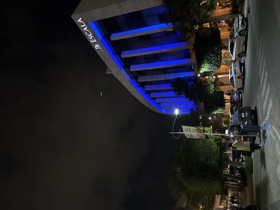 The photograph captures a night scene. A modern building with illuminated blue accents, labeled "ESCALA," dominates the upper frame. Below, a street is populated with parked cars and pedestrians. The scene is partly lit by a street lamp, around which foliage is visible. The sky to the left is dark, suggesting a late hour.