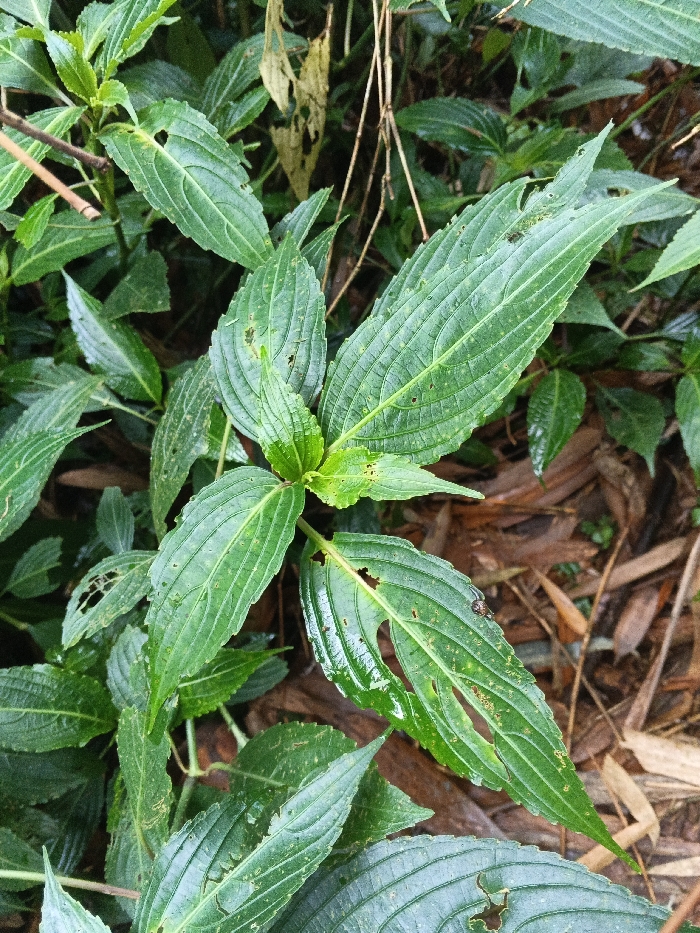 The image presents a close-up view of a green plant located in Situm, Papua New Guinea. The plant features numerous elongated, ovate leaves with prominent venation, exhibiting various shades of green, some appearing moist. Multiple leaves display irregular holes, tears, and brown spots, indicating prior insect herbivory or damage. A small, dark-bodied insect is visible resting on the upper surface of a leaf in the lower-right quadrant. The background shows additional blurred green foliage and brown organic matter, including dried plant debris, on the ground. No human subjects or actions are depicted.