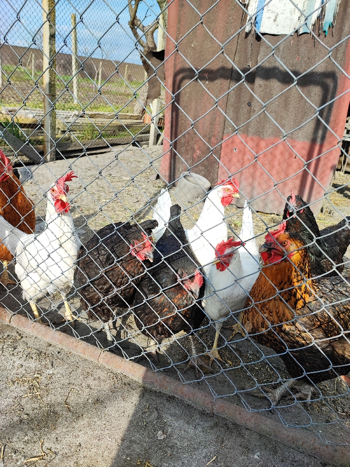 The image depicts an outdoor scene in Musachevo, Bulgaria, observed through a chain-link fence. Seven domestic chickens are visible within an enclosure. From left to right, the chickens include one reddish-brown, two white, and four black/dark brown birds. All chickens are standing on a dirt ground covered with scattered debris and dry organic matter. Their heads, combs, and wattles are clearly visible through the fence mesh. In the mid-ground, behind the chickens, is a weathered, reddish-brown corrugated metal panel, possibly part of a structure, with a blue and white striped fabric hanging over its top edge on the right. To the left of this panel, a light-colored wooden post is visible. The ground appears uneven, with patches of sunlight and shadow. The background shows an open, undeveloped field under a clear blue sky, suggesting an agricultural or rural setting. Distant trees or vegetation lines are discernible on the horizon. A second wooden post is visible further back in the field. The lighting indicates a sunny day, casting shadows from the fence onto the ground in the foreground. No people are present.