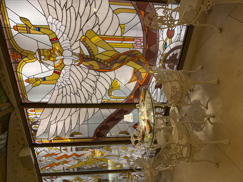 This image depicts an indoor dining or lounge area in Ubud, Indonesia, distinguished by a series of large, multi-panel stained glass windows. The prominent central stained glass panel features a stylized, winged figure with raised arms, rendered in yellow, white, brown, and orange hues, holding what appear to be ankh-like symbols. This artwork exhibits characteristics of Egyptian revival or Art Deco aesthetics. Adjacent stained glass panels display abstract geometric patterns, including orange motifs resembling lightning bolts. In the foreground, a round glass-top table with an ornate white metal base is centered. It is surrounded by four matching ornate white cast-iron chairs, each fitted with a light-colored cushion. The table is prepared with multiple drinking glasses, two shakers, and several elongated items, possibly bread rolls or wrapped packages. A small, illuminated decorative table lamp stands in the center of the table. Additional similar tables and chairs are partially visible to the left. A white speaker is mounted on an ornate, light-colored wall section above a stained glass panel in the upper left of the frame. The floor is a light, monochromatic surface with subtle variations. No individuals are present in the scene.