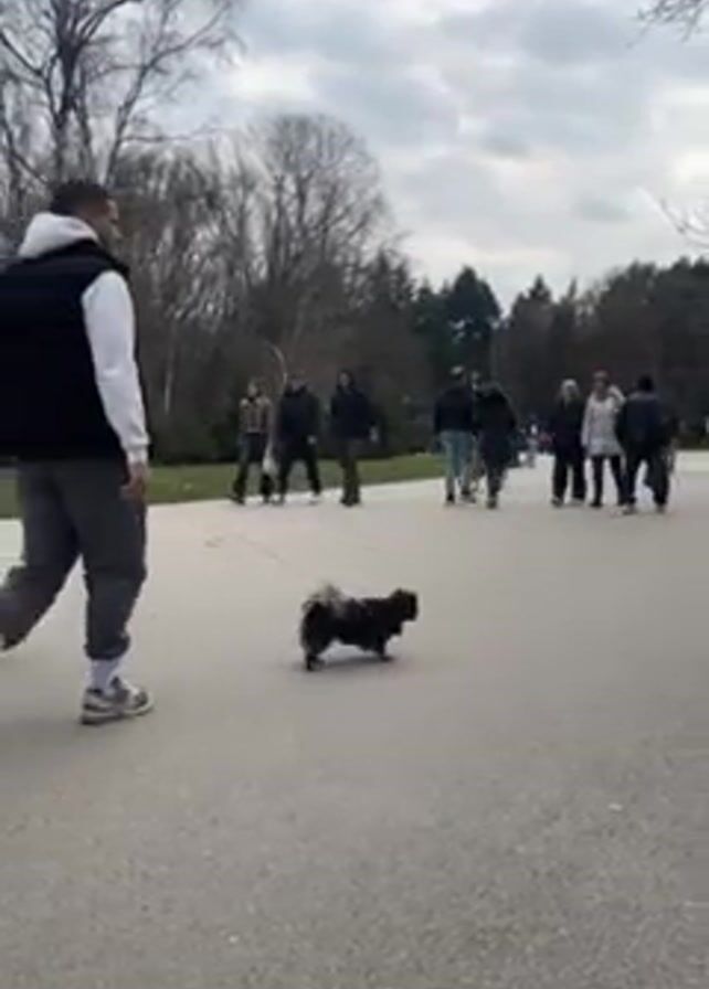 paved pedestrian area in what appears to be a park. A man wearing a white sweatshirt and a black vest walks a small black dog on a leash. Several other people are walking in the same direction. Some are walking alone, while others are in pairs or small groups. A bicycle is visible among the pedestrians. Bare trees line the edges of the paved area, and evergreens are in the background. The sky is overcast. The video is shot from a seated position, with the bottom of the frame showing the legs of the person recording. The focus of the video shifts with the moving dog and its handler.