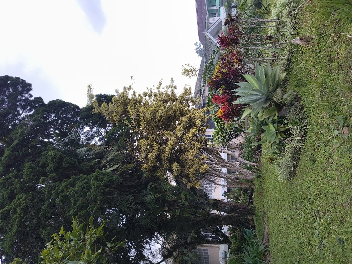 The image presents an outdoor scene within the city of Unknown, Vietnam, under an overcast sky. The foreground consists of a dense, green lawn covering the lower half of the frame. Embedded within the lawn, slightly right of center, is a garden bed featuring a prominent light green agave plant with broad, pointed leaves. Surrounding the agave are smaller green plants, and to its immediate right, a collection of slender, vertical stalks. Further behind and to the right of the agave is a section of dense foliage characterized by red and dark green broad-leafed plants. In the midground, several trees are visible. A large tree with thick, dark green foliage and a textured trunk dominates the left side, extending high into the frame. To its right, a group of trees with lighter-colored, seemingly moss-covered trunks and sparse, yellowish-green foliage is present. The background reveals structures partially obscured by the trees and plant beds. On the left, a light-colored building with multiple windows is visible. On the right, further in the distance, a white building with a green or dark-colored roof and prominent gables is situated. The upper right portion of the image shows an expanse of bright, overcast sky. No individuals, overt actions, or direct interactions are depicted. The overall environment appears to be a cultivated garden or park area.