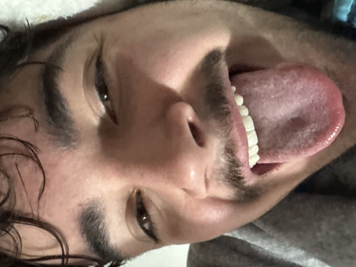 The image presents a close-up, angled portrait of a young male individual, approximately from the upper chest to the top of the head. The subject has fair skin, dark curly hair partially visible on the upper right, dark eyebrows, and brown eyes. He possesses a mustache. The individual is smiling, exposing his upper teeth, which are uniformly white, and has his tongue fully extended out of his mouth towards the viewer. The tongue surface shows visible papillae. The subject's head is tilted to the left, and he is looking directly at the camera. A portion of a grey hooded garment is visible on the upper left side of the frame, near the subject's neck and shoulder. Lighter-colored fabric, possibly bedding or another garment, is visible on the lower left and bottom right edges, suggesting an indoor environment where the subject may be resting. The background is out of focus and featureless, providing no identifiable details. There are no visual elements within the image to corroborate the specified location of Bragança, Portugal.
