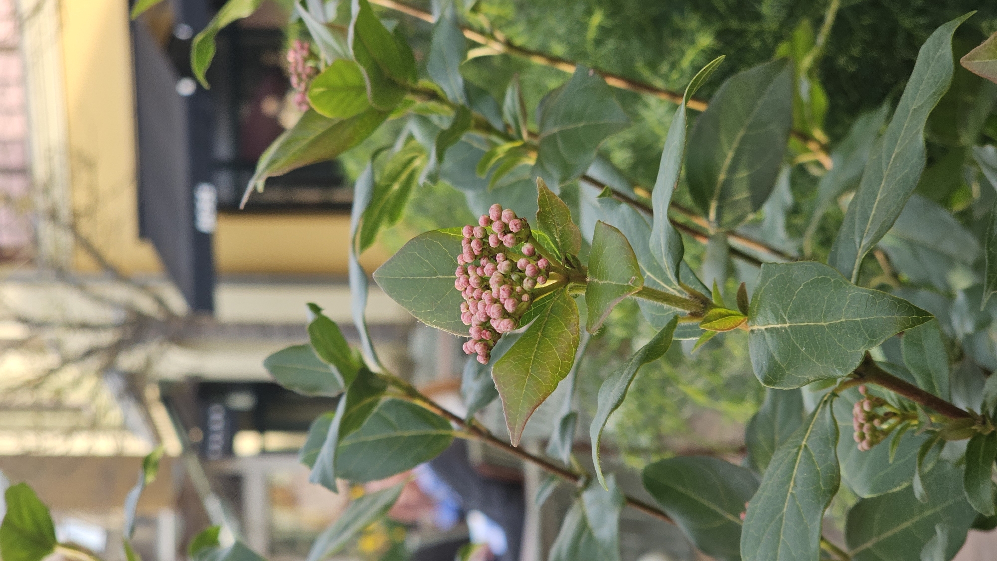 - "The image presents a close-up, vertical-orientation view of a plant featuring dark green, oval-shaped leaves and clusters of unopened, round, pink flower buds" by FM-glf8h1, licensed under CC BY 4.0