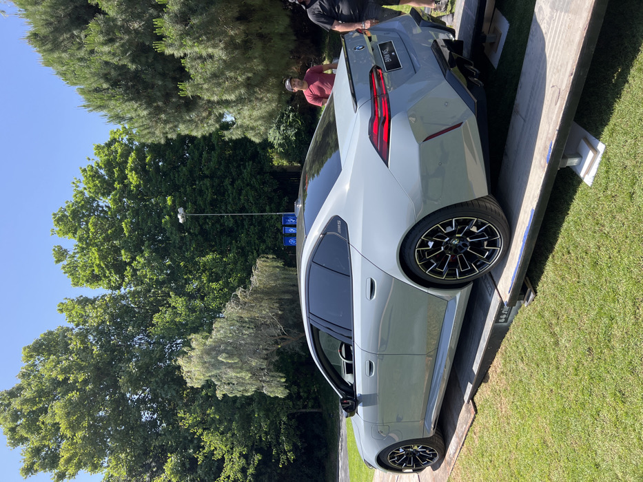 gray BMW i7 on a flatbed trailer in a grassy field. The trailer is made of wood and metal and is sitting on top of green grass. Two men are standing behind the car. One of the men is wearing a red shirt and a baseball cap. The other man is wearing a black shirt. The BMW is parked in a grassy field in front of a dense stand of trees. The sky is blue and clear. The coordinates 32.229, 34.84 indicate that this image was taken in a grassy field near the city of Ga'ash, Israel.