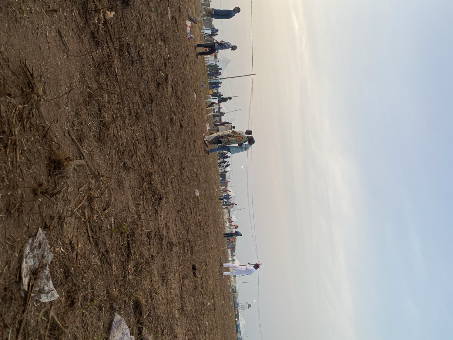 A large outdoor gathering takes place on a dirt field. Numerous people are scattered throughout the space, some appearing to be seated while others stand and converse. White tents are visible in the background, suggesting a formal event. The sky is lightly clouded, casting a soft light over the scene. A few utility poles are present on the horizon. Litter is strewn on the ground.