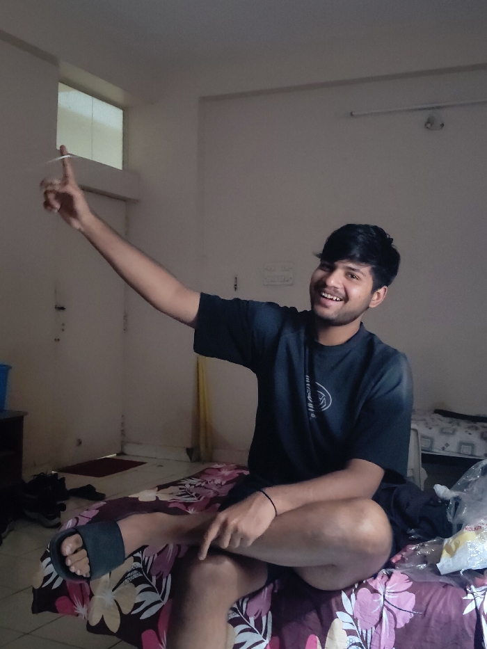 A young adult male, appearing to be of South Asian descent, is seated cross-legged on a bed in an indoor room, likely a bedroom or dormitory, in Bengaluru, India