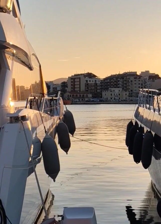 The camera is positioned between two docked boats, looking out toward a city during sunset